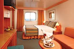 Picture window, two lower beds can convert to queen size. Direct dial, ship-to-shore telephone service, television, hair dryer, safe deposit box and mini-bar in every stateroom.
