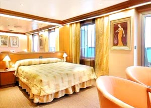 Oceanview with veranda, Two lower beds can convert to queen size, whirlpool bath, shower and sitting area. Direct dial, ship-to-shore telephone service, television, hair dryer, safe deposit box and mini-bar in every stateroom.
